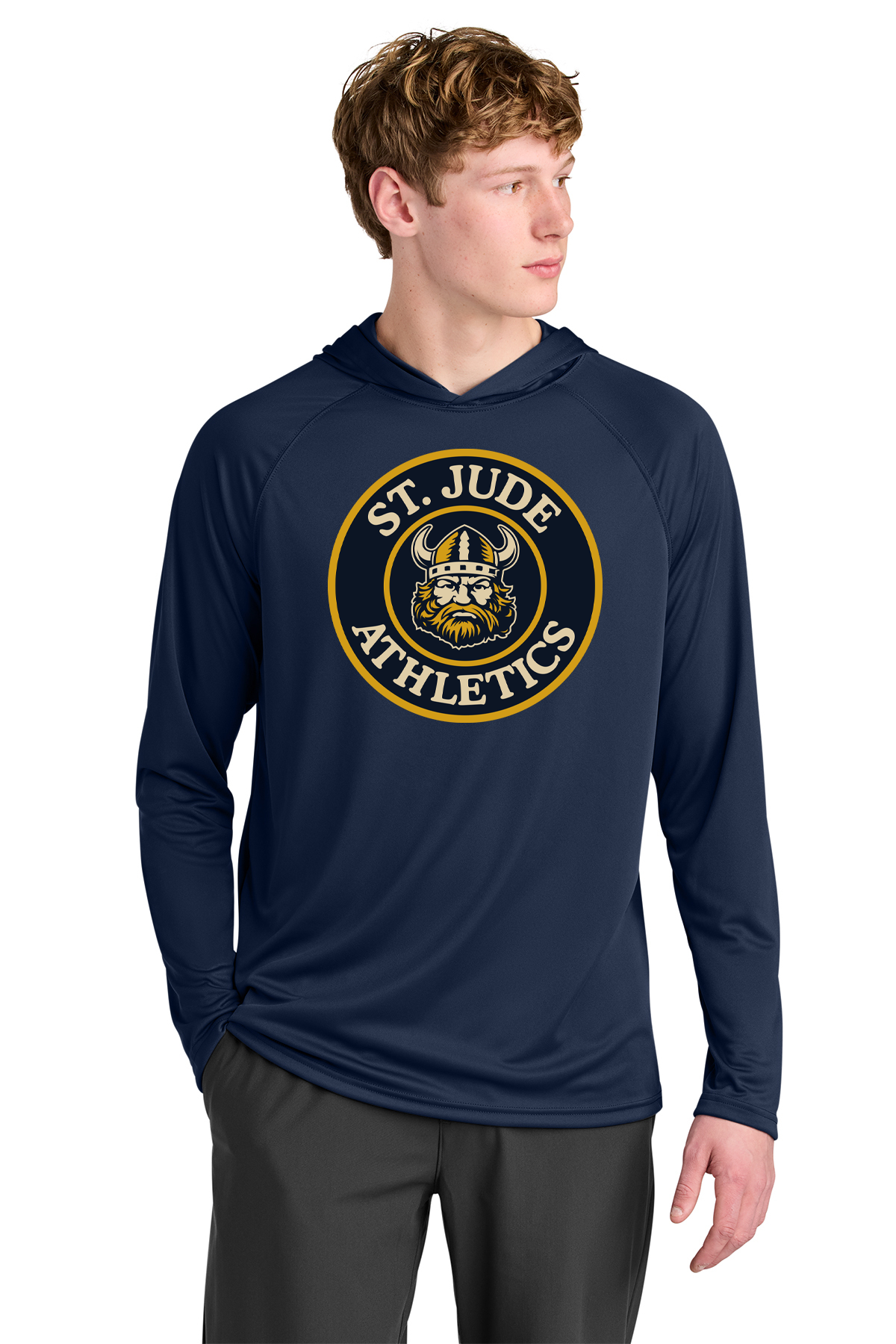 A top choice for sports and exercise; this hooded long sleeve tee combines a comfortable fit with performance features such as being able to wick moisture and protect you from the sun.