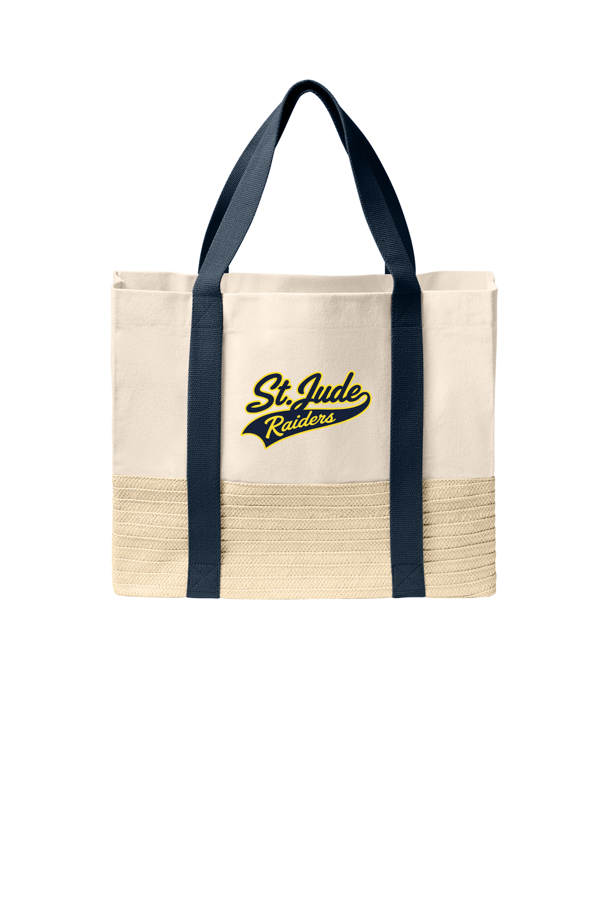 - Dimensions: 14"h x 18.1"w x 6.7"d - 100% cotton canvas - Natural canvas top panel - Natural paper ribbon straw lower body - Colored web handles - Interior hanging pocket